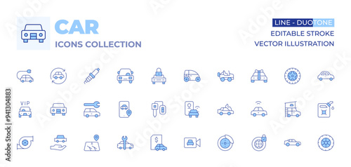 Car icons collection. Line Duotone style, editable stroke. car key, taxi, wiper, phone, location pin, car loan, security camera, car, car service, car repair, air filter
