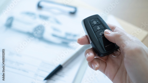Car key in hand with paperwork and pen on table showing the automobile contract signing process and vehicle purchase concept