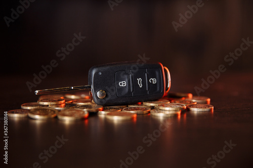 Car key with coins. Concept of the saving money for car, trade car for cash.