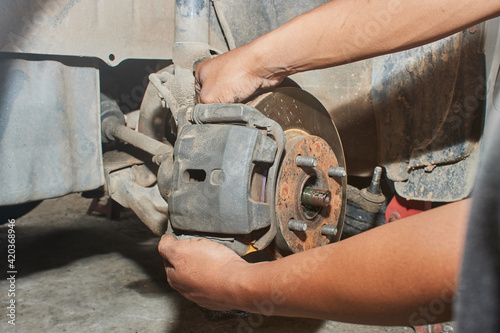 Car Mechanic Assemble Brake Caliper to Front Car Wheel Hub in Car Repair Shop