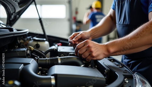 car mechanic repair. Hands of technician fixing engine under open hood in workshop. Professional auto service emphasizes maintenance, diagnostics, and vehicle safety..