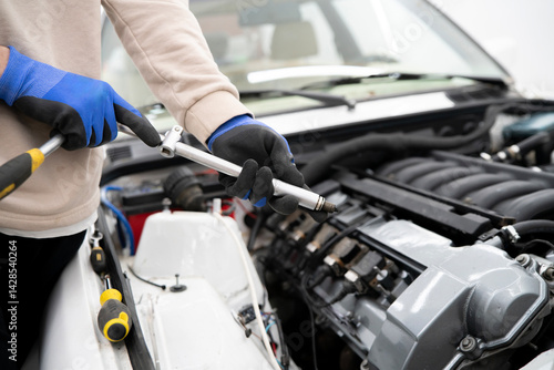 Car Mechanic Utilizes Spark Plug Wrench for Efficient Engine Maintenance in a Professional Workshop Setting