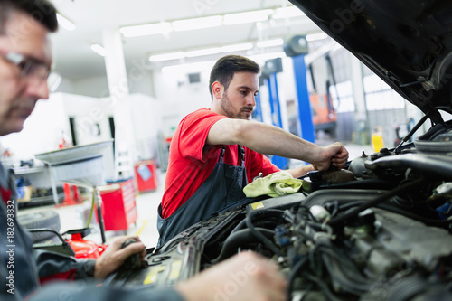 Car mechanics working at automotive service center
