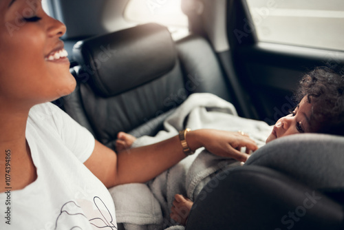 Car, mother and baby in seat for child care, playful and bonding together with smile in transport. Safety, mom and little girl with parent for travel, road trip and journey in vehicle as family