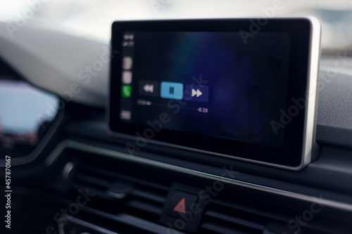 Car multimedia system. Glowing beautiful dashboard of a modern expensive car. The interior of the car. The foreground is blurred. Modern car interior details. Selective focus