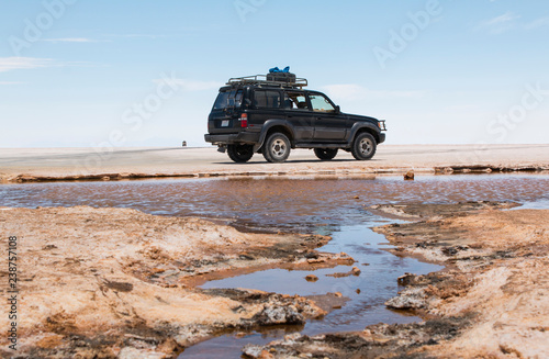 Car near a lake on Uyuni salt flat. Uyuni Bolivia.