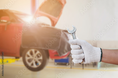 Car repair shop service centre, auto mechanic hand hold wrench working tool in garage
