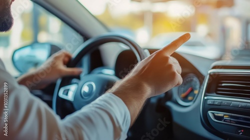 Car salesman explaining safety features with enthusiastic body language in a modern vehicle's interior during daylight