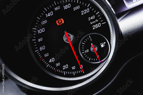 Car speedometer, luxury dashboard with glowing red indicators close-up view, background photo