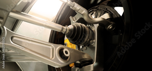Car suspension and drive shaft. Structure of EV car spare parts. Such as Front or Rear suspension Shock absorber suspension Brake. Elements of the suspension and Chassis structure. Car service repair.