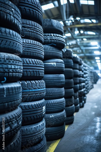 Car tire piles in factory storage area for industrial waste management.