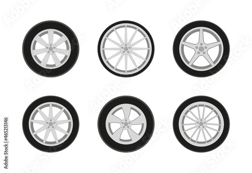 Car wheel. Car tire with rim. Icon of sport auto tyre. Set of rim from alloy for truck and race automobile. Design of wheel with steel and rubber. Pictogram for logo. Different vehicle tires. Vector