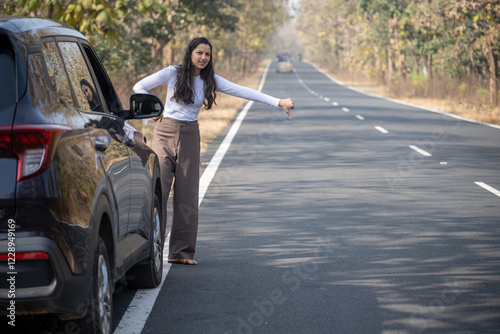 Car with open hood and emergency lights staying on the roadside in forest. hitchhikes to ask for help