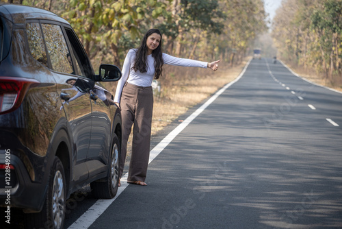 Car with open hood and emergency lights staying on the roadside in forest. hitchhikes to ask for help