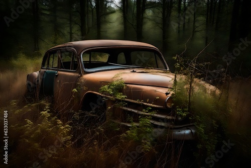 car wreck in bushes, old cars, abandoned cars, muscle car, classic car - Generative AI