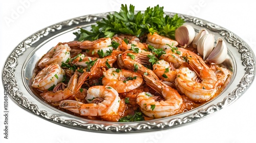 Carabineros prawns in a spicy tomato sauce, isolated on a silver plate with decorative garlic cloves and fresh parsley on a white backdrop