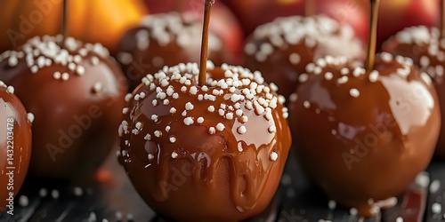 Caramel apples coated in milk chocolate and sprinkled with sea salt crystals on dark surface, close-up view showing glossy coating and drips.