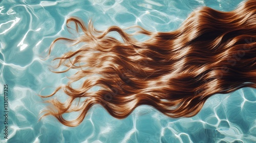 Caramel Brown Wavy Hair Floating in a Perfectly Symmetrical Shape Over Transparent Water with Sunlight Patterns. Copy space. Generative AI