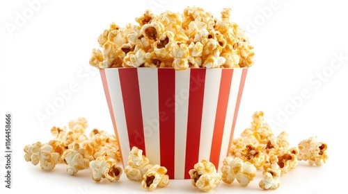 Caramel popcorn in a striped bucket on white background showcasing delicious snack perfect for movie nights and celebrations