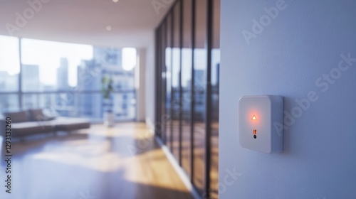Carbon monoxide sensor flashing in a modern apartment with glass windows. Featuring caution and safety