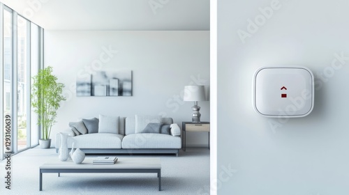Carbon monoxide sensor in a minimalist living room with white walls. Featuring vigilance and comfort