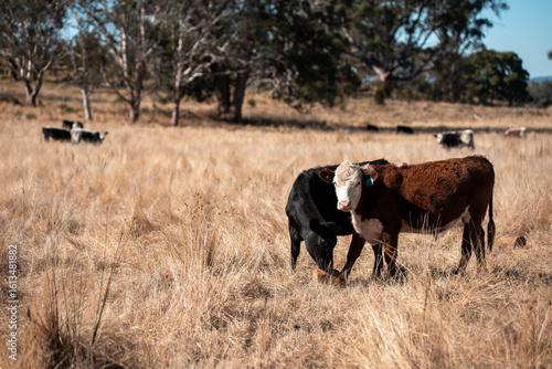 Carbon neutral cattle farming in a free range field on a farm in Australia beautiful cattle in Australia eating grass, grazing on pasture. Herd of cows free range beef being regenerative raised