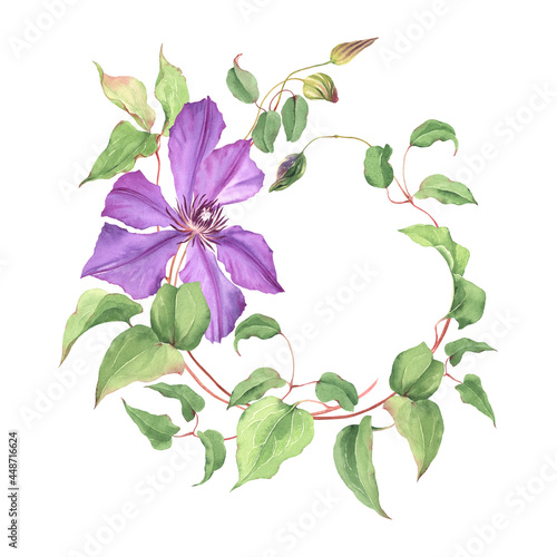Card of clematis, wreath with green leaves, buds and purple flower, watercolor beautiful circle frame for your text or design, delicate floral illustration isolated on white background.