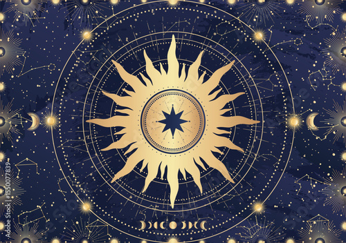 Card of mystical Sun, Moon, crescent, star, sunburst, night sky. Constellation galaxy celestial space. Spiritual zodiac horoscope, astrology sign, astronomy symbol. Magic vector illustration on blue