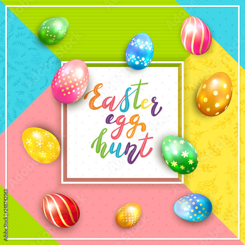 Card on Colorful Background with Lettering Easter Egg Hunt and Painted Eggs