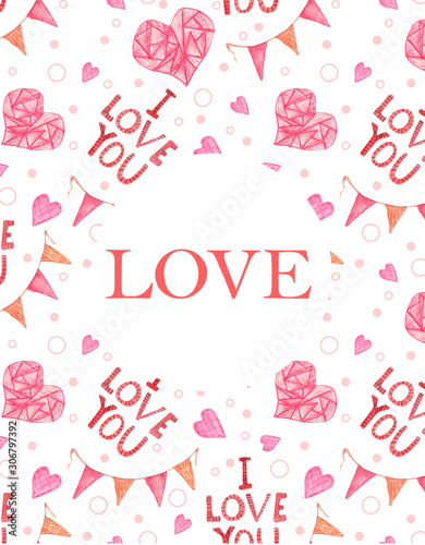 Card with pink hearts drawn by hand with watercolors on a white background, card with the word love in pink for Valentine's day