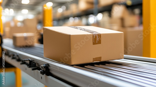 cardboard box on conveyor belt in warehouse setting, showcasing logistics and shipping processes. scene conveys efficiency and organization in package handling