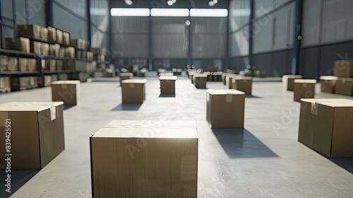 cardboard boxes against steel wall panels, highlighted by the stark contrast of a grey floor and blue ceiling, offering ample room for text or product display.