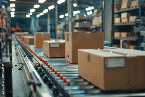 Cardboard boxes moving on a conveyor belt in a distribution warehouse