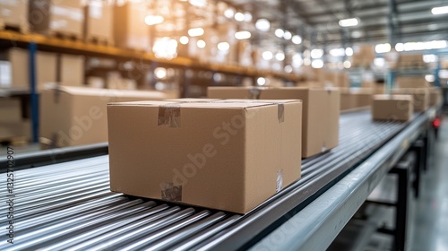 Cardboard boxes on a conveyor belt inside a distribution warehouse