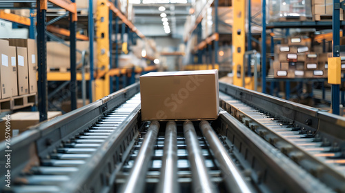 Cardboard boxes on a conveyor belt inside a modern logistics warehouse, supply chain background