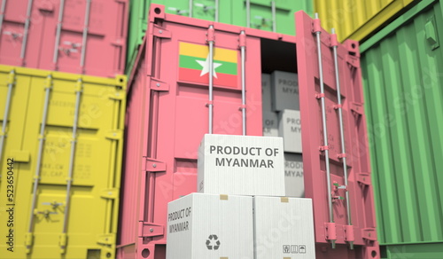 Cardboard boxes with goods from Myanmar and cargo containers. Industry and logistics related conceptual 3D rendering