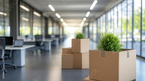 Cardboard boxes with potted plants sit in a modern, bright office hallway. Empty desks and computers are visible in the background.