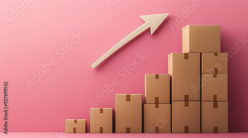 Cardboard packages stacked in a step formation with an upward arrow, representing growth in logistics, shipping, and e-commerce business.
