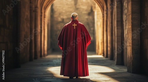 Cardinal in Red Cassock Walking in Historic Archway. Generative ai