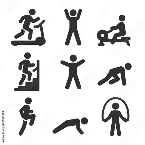 Cardio Activity Icons. Solid style icons of cardio activities: treadmill run, cycling bike, rowing machine, stair climber, jumping