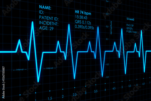 Cardiology concept with blue digital heart rate chart and personal patient information on dark medical screen background. 3D rendering