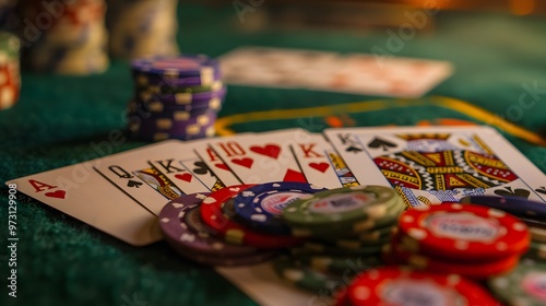 Cards and Chips: A poker scene with playing cards and a stack of colorful poker chips on a green felt table.