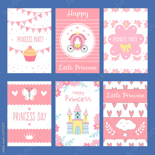 Cards with funny illustrations for kids. Little princess and fairy tale symbols