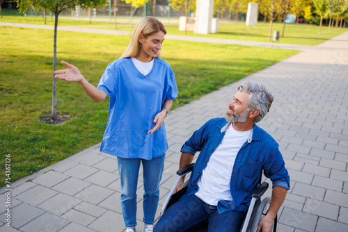 Care and Compassion: Nurse Accompanies Man in Wheelchair Outside