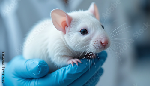 Care and Precision A Close-Up of a White Lab Mouse in Blue Gloved Hands