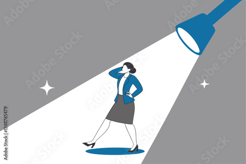 Career guidance or advice to step up career path, business direction or spotlight to success, discover talent or job candidate concept, flashlight staircase light beam to step up for businesswoman.