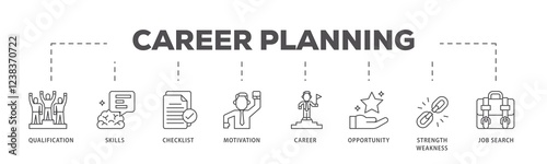 Career infographic icons flow process which consists of define goal, checklist, strengths weaknesses, motivation, qualification, support and success icon live stroke and easy to edit .