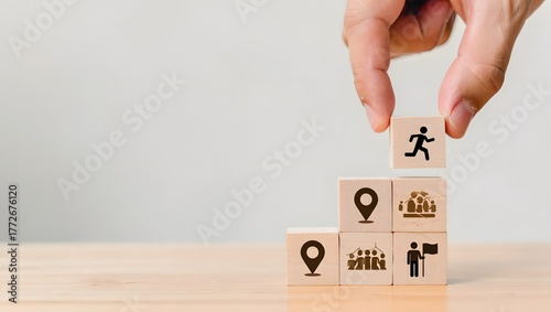 Career Path and Development Strategy Concept. Arranging wooden blocks with icons success roadmap and journey, symbolizing a structured career path and strategic development. Planning, growth, progress