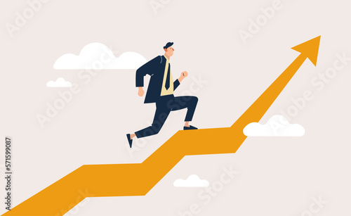 Career path to grow, achievement and success in job or leadership to win business concept, businessman running on rising arrow to the sky.