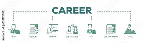 Career planning icon infographic illustration concept with icon of advice, checklist, training, job exchange, cv, job application and goal icon png and easy to edit